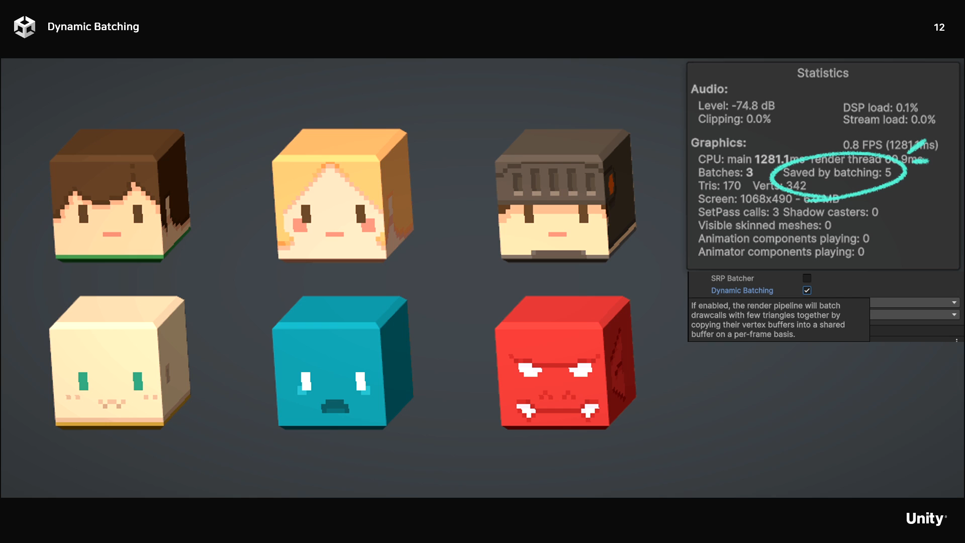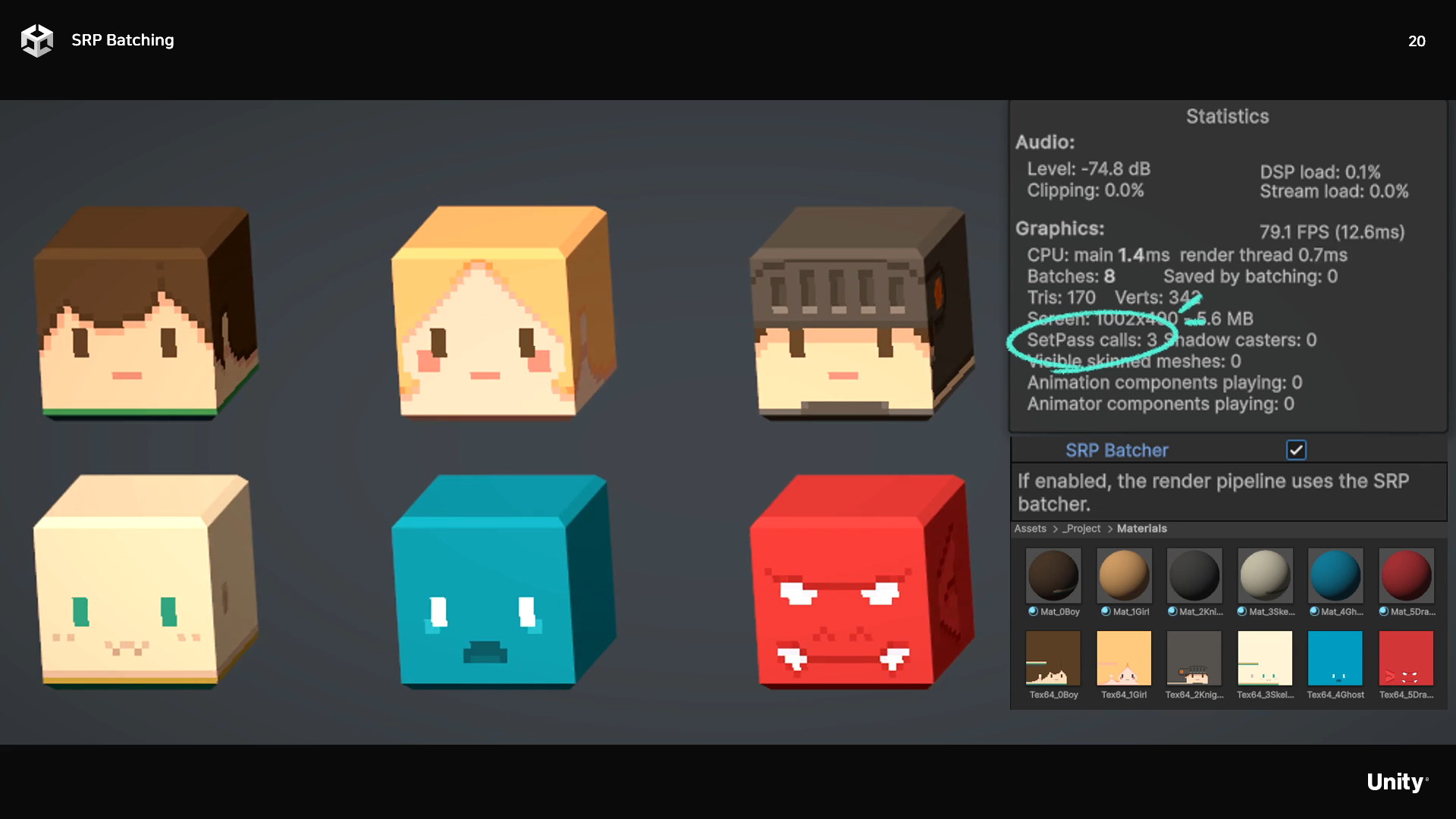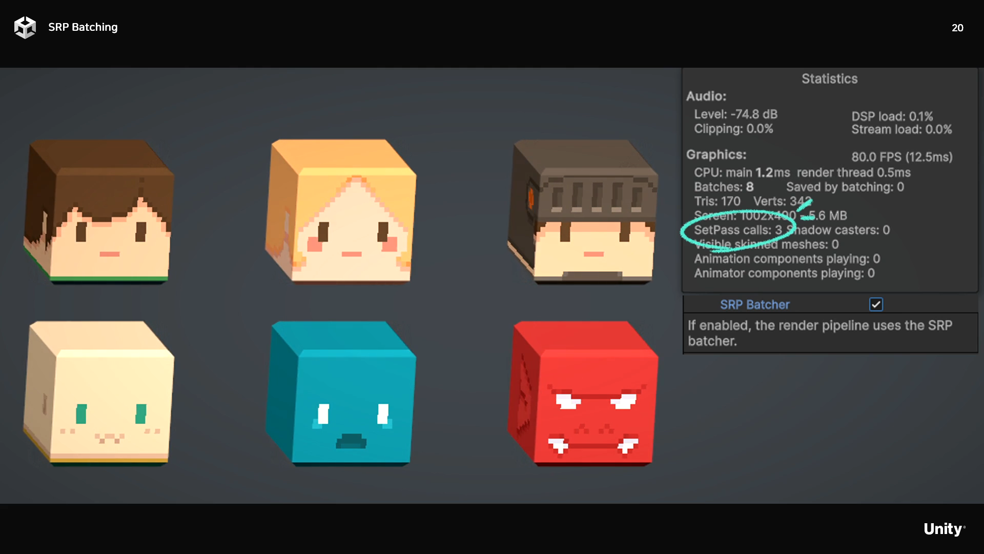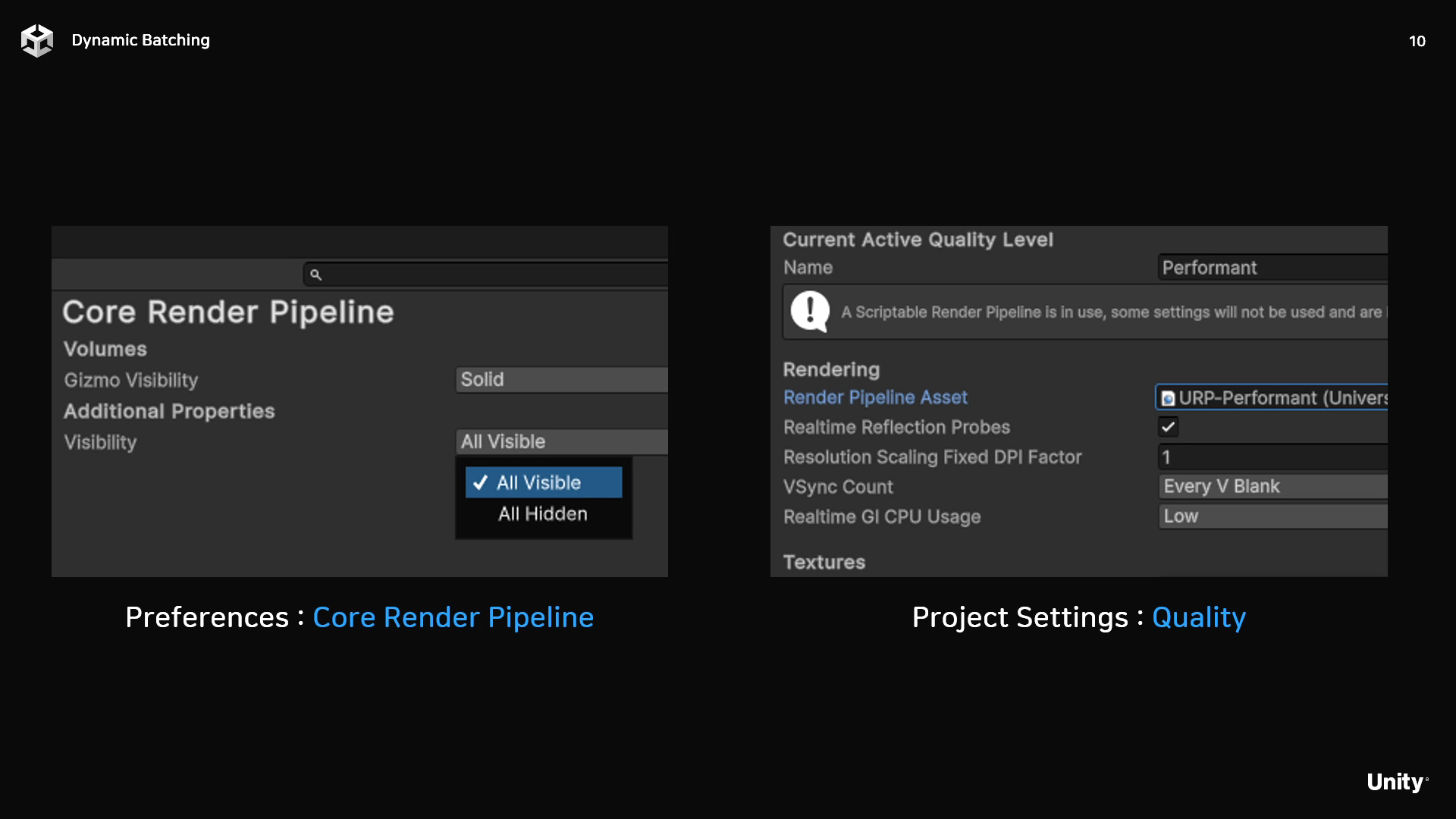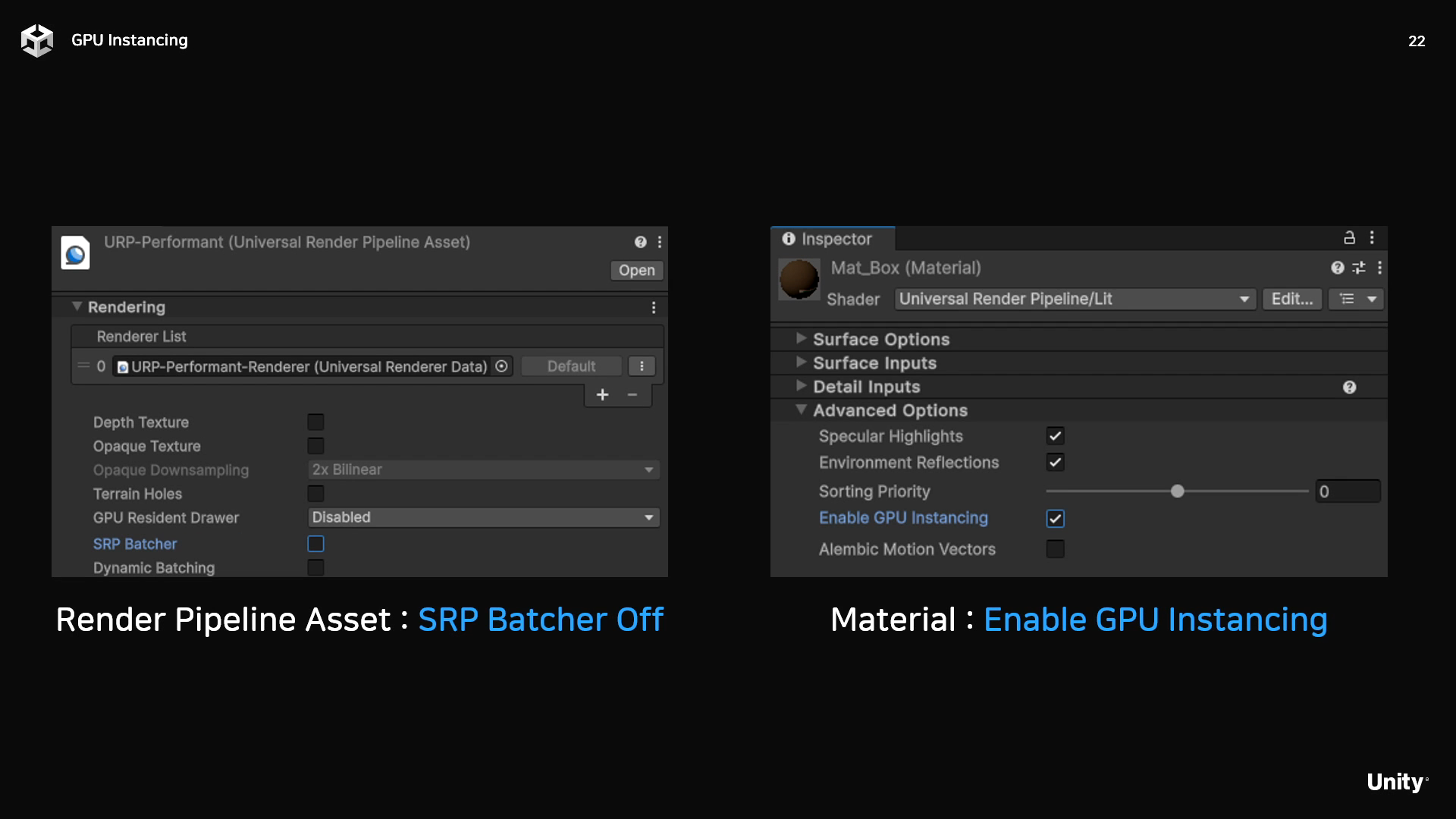 | URP 또는 HDRP를 쓰는 프로젝트에서 SRP Batcher는 기본 활성화 |