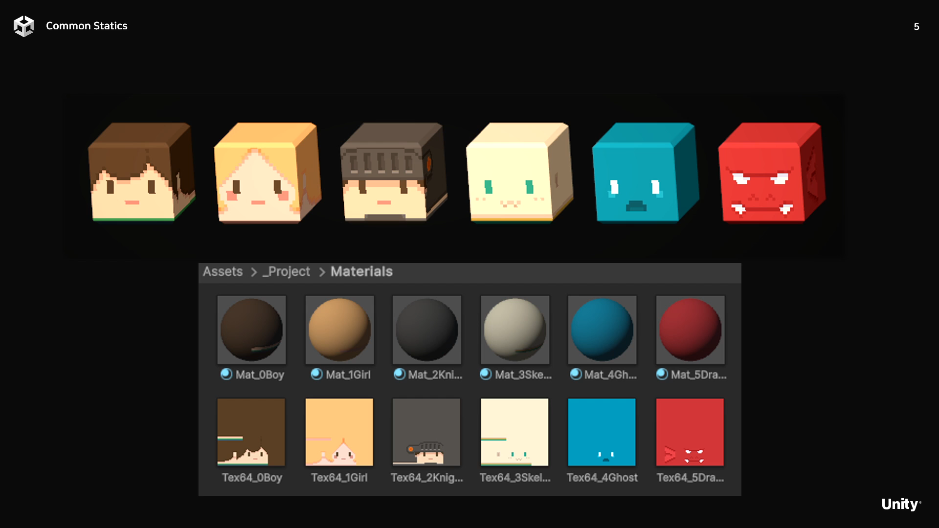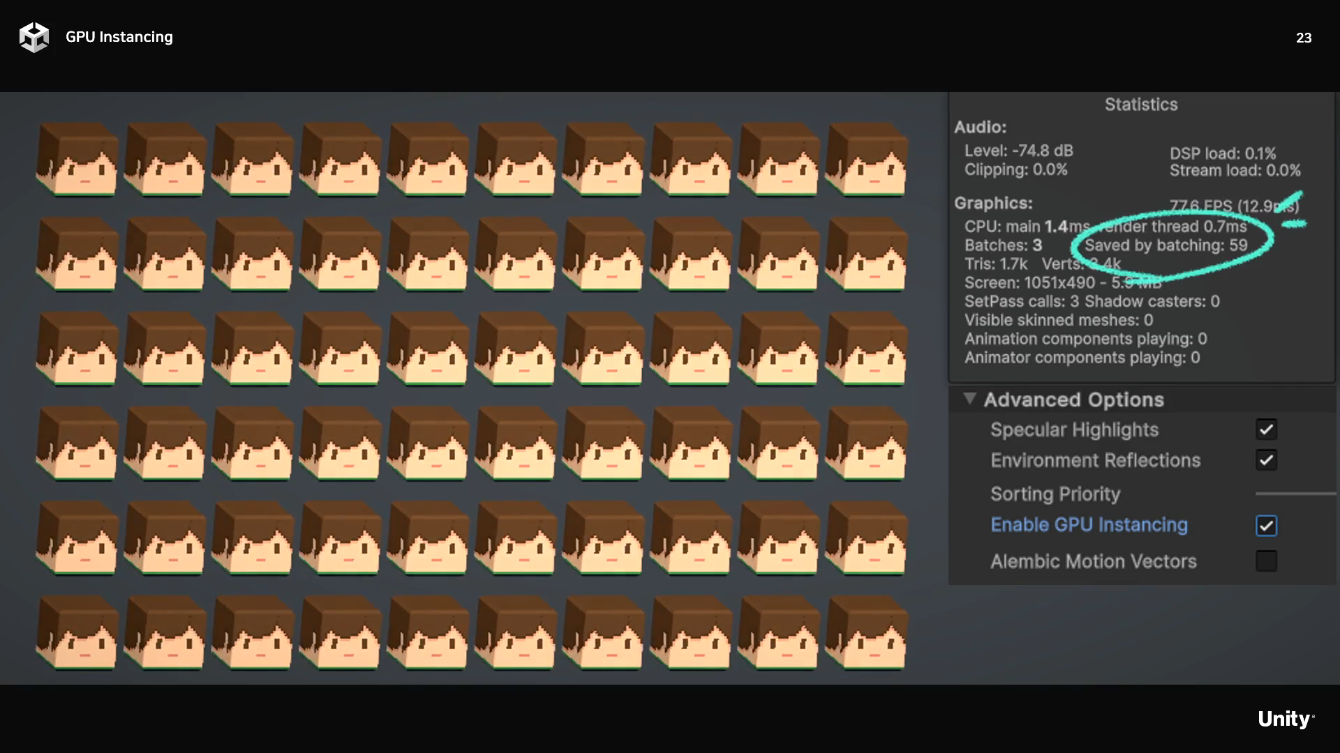 정적 배칭 ㅡ 맵, 장식 GPU 인스턴싱 ㅡ 소환수, 잔디, 군대 아틀라스 텍스쳐 사용 |