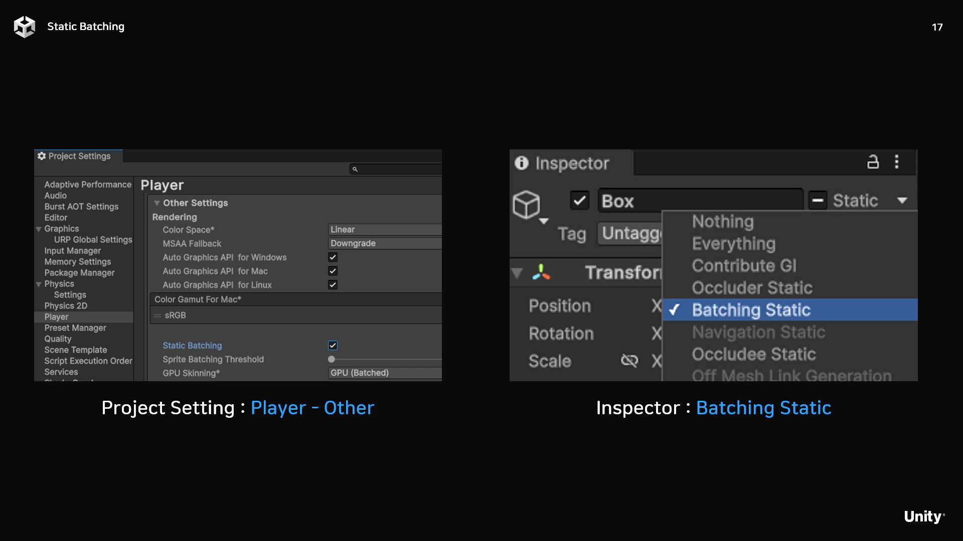 프로젝트 세팅 ㅡ 플레이어 ㅡ 오더 세팅 ㅡ 스태틱 배칭